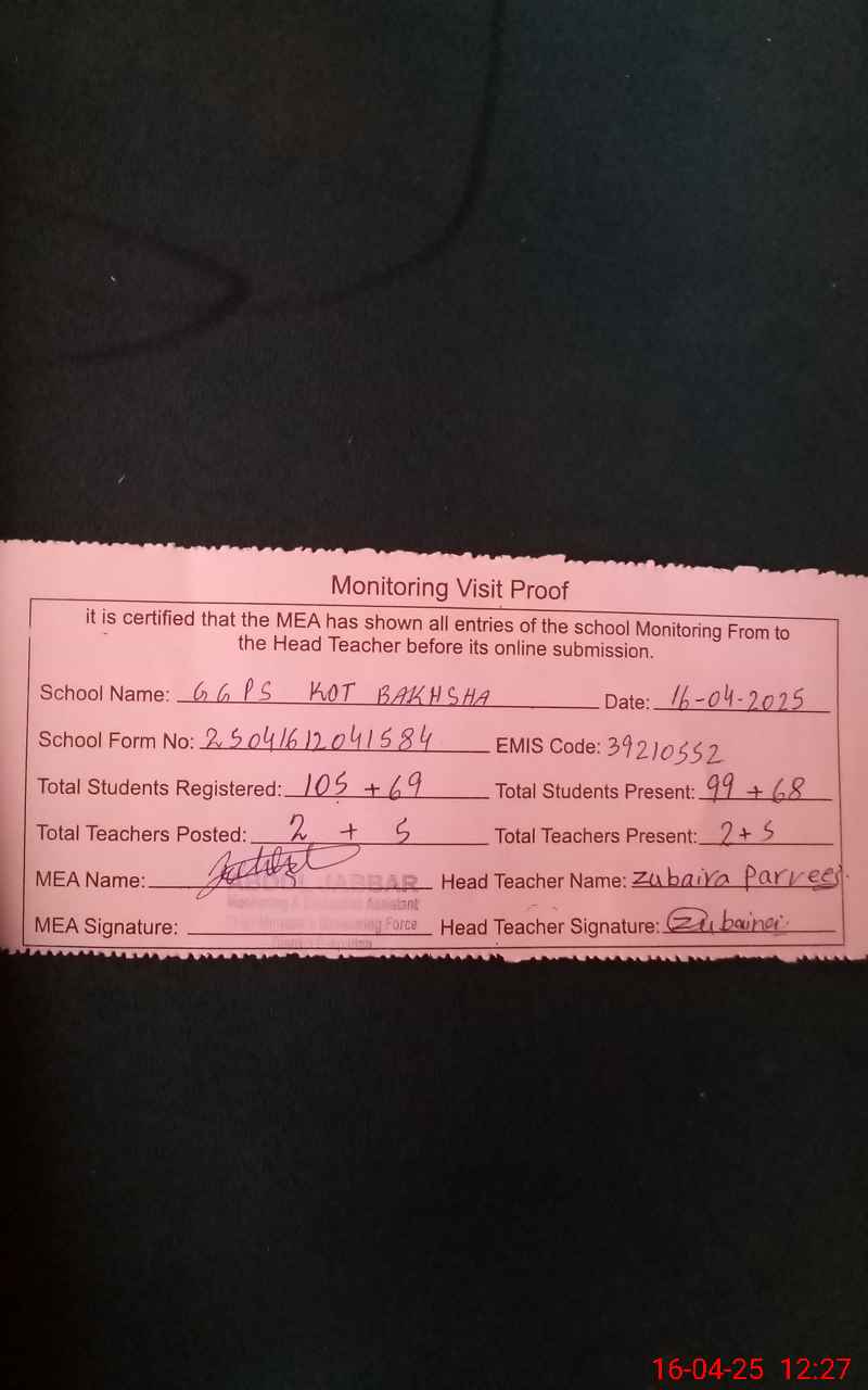 | EMIS Code: 39210552 | Name of School: GGPS KOT BAKHSHA | |||