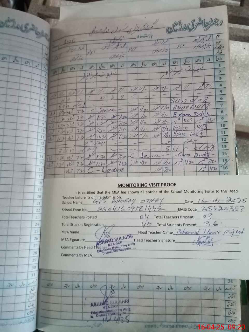 | Attendance Register | Head Teacher | MEA with School | Visit Proof |