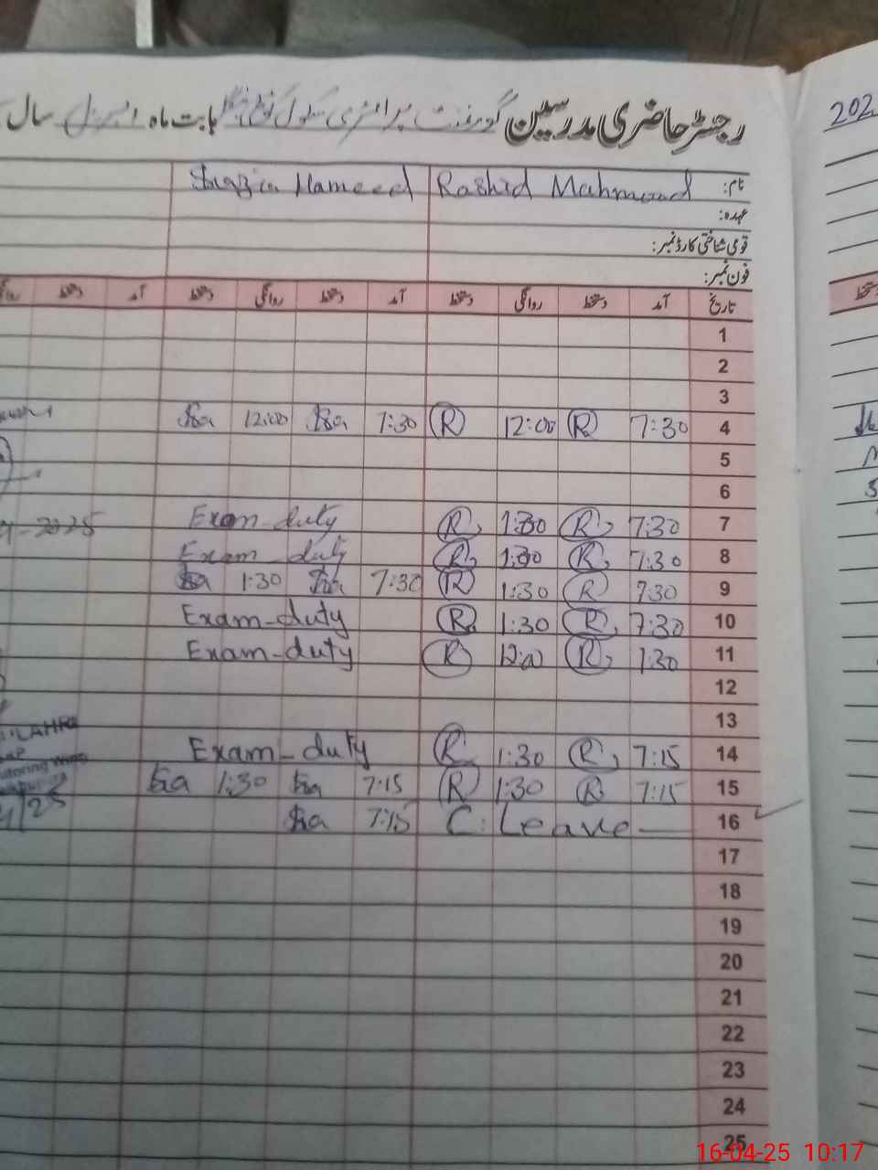 | CNIC | Full Name | Designation | R/C | Absence During Last Calender Month |