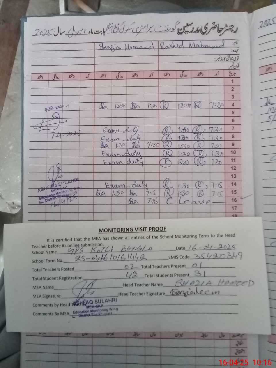| Attendance Register | Head Teacher | MEA with School | Visit Proof |