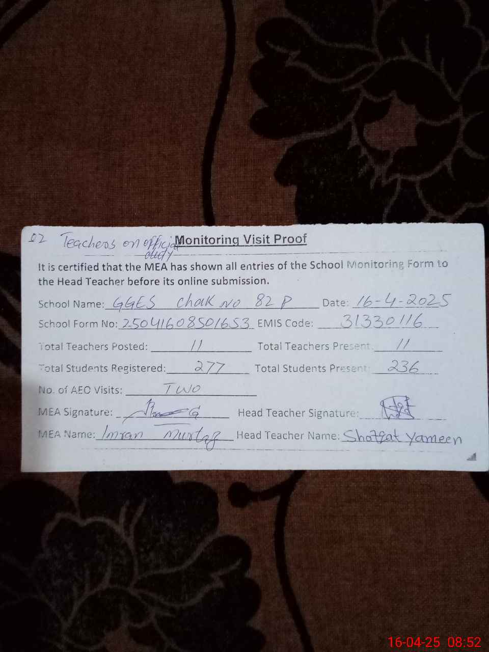 | Attendance Register | Head Teacher | MEA with School | Visit Proof |