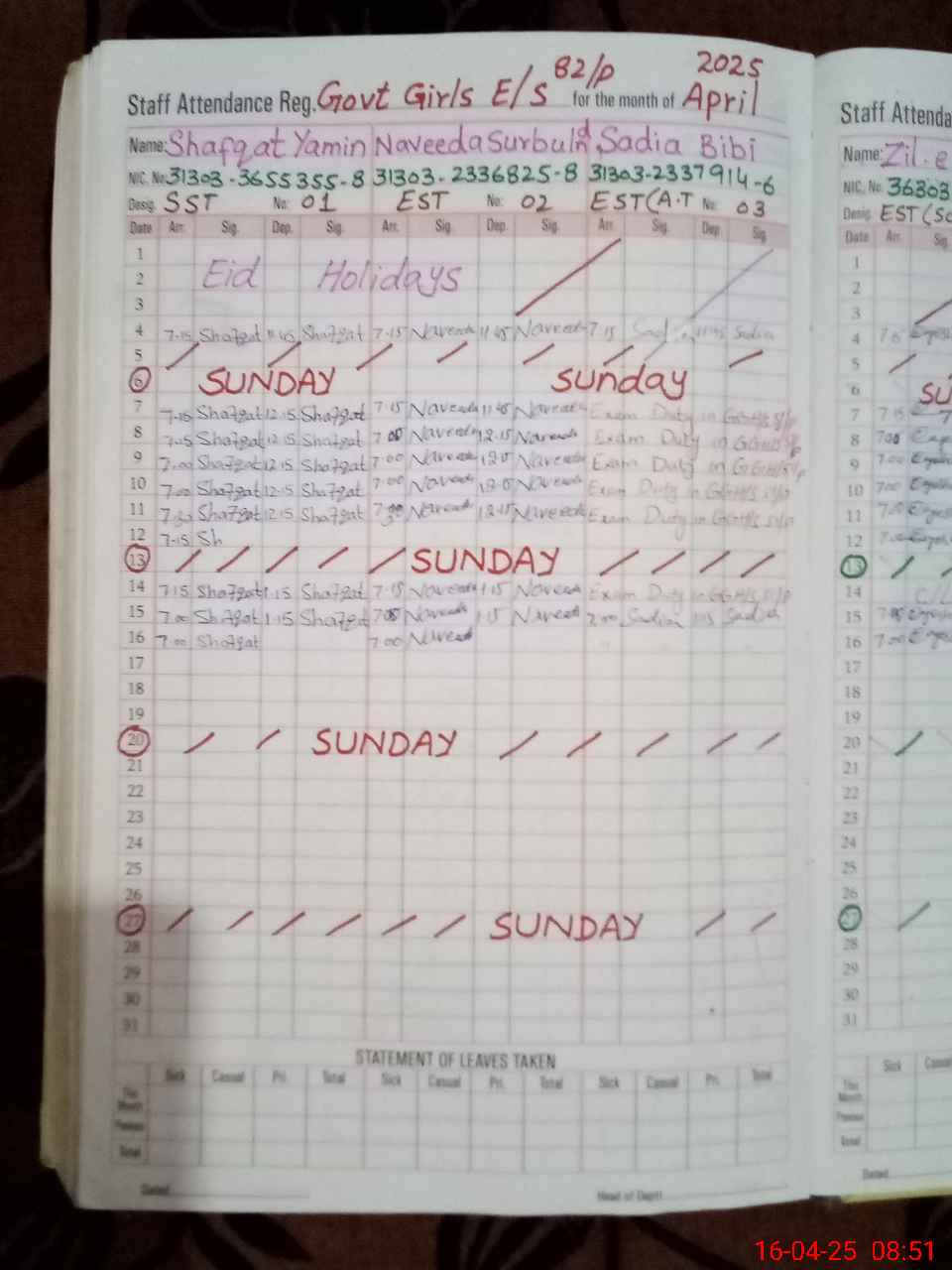 | 31**** | Sh**** Ak**** | PST | Regular | 0 | 13 | 0 | 0 | 0 | 0 | 0 | 0 | 0 | Exam Duty |