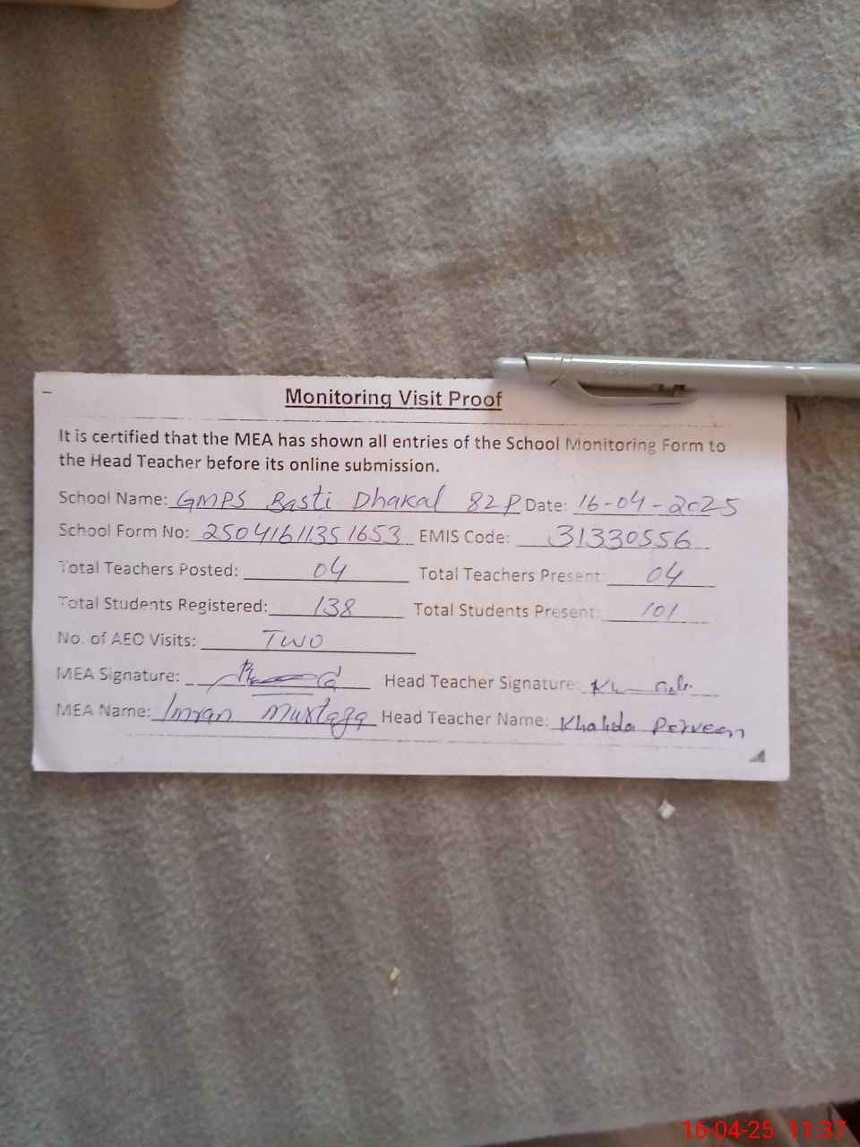 | Attendance Register | Head Teacher | MEA with School | Visit Proof |