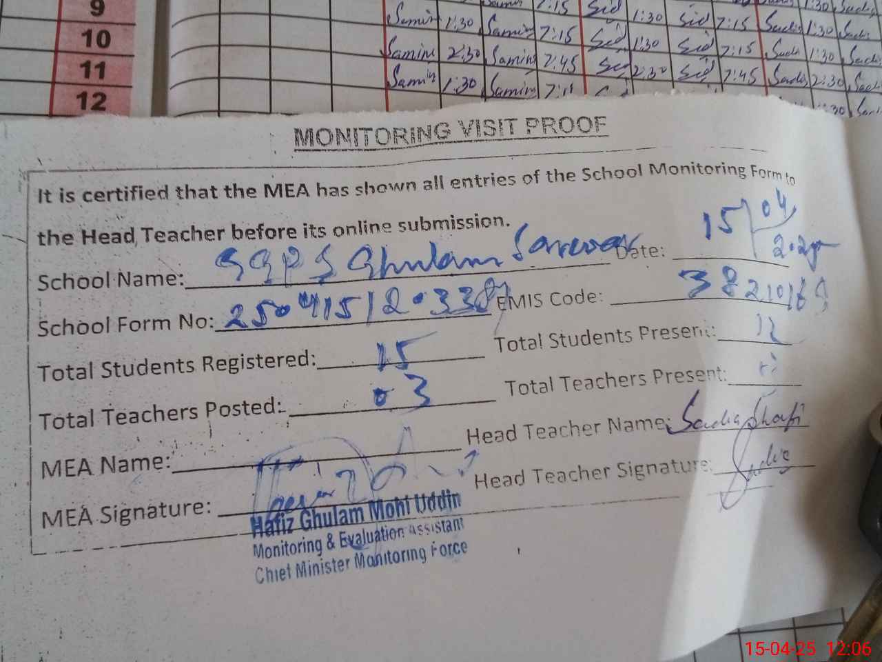 | Attendance Register | Head Teacher | MEA with School | Visit Proof |