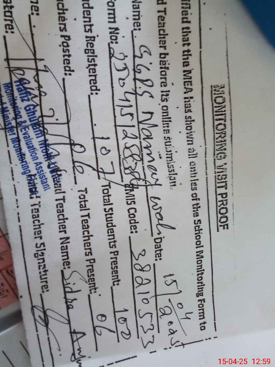 | EMIS Code: 38210533 | Name of School: GGPS NAMAY WALI | |||