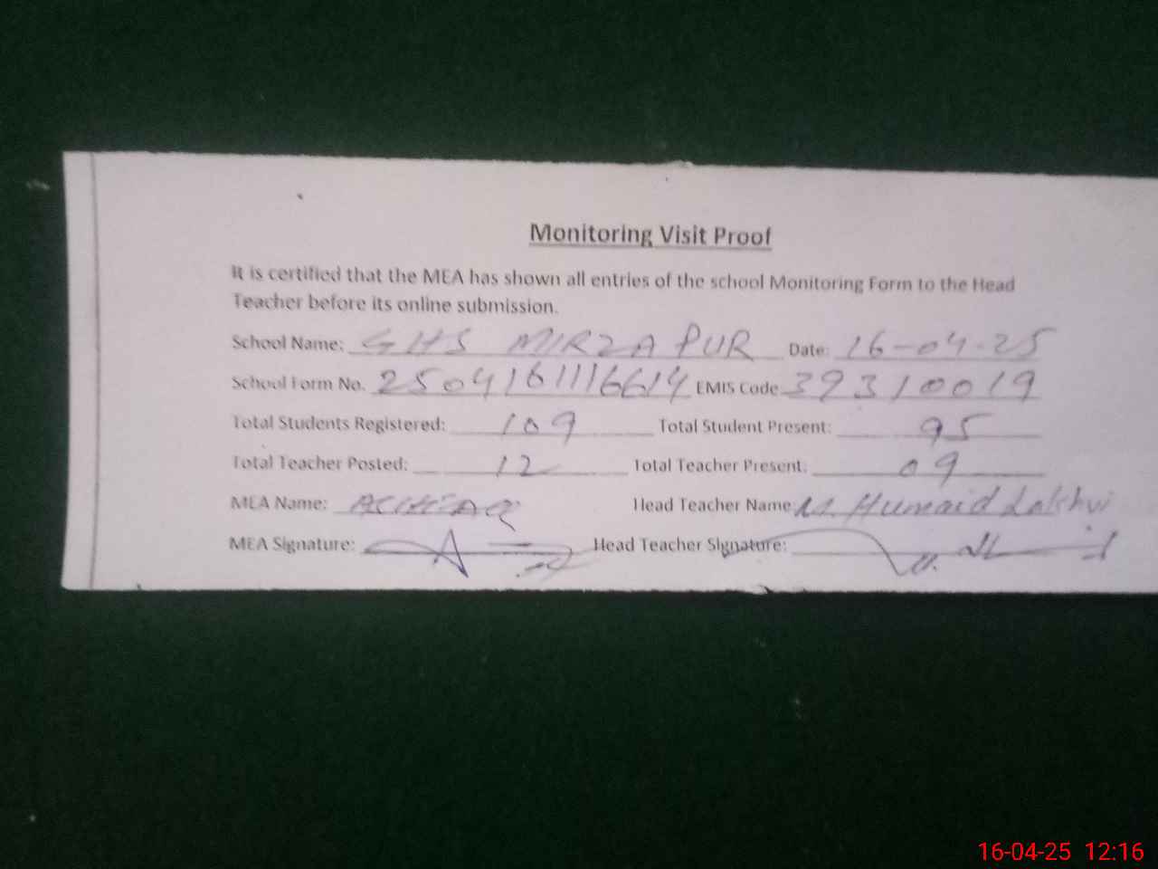 | Attendance Register | Head Teacher | MEA with School | Visit Proof |