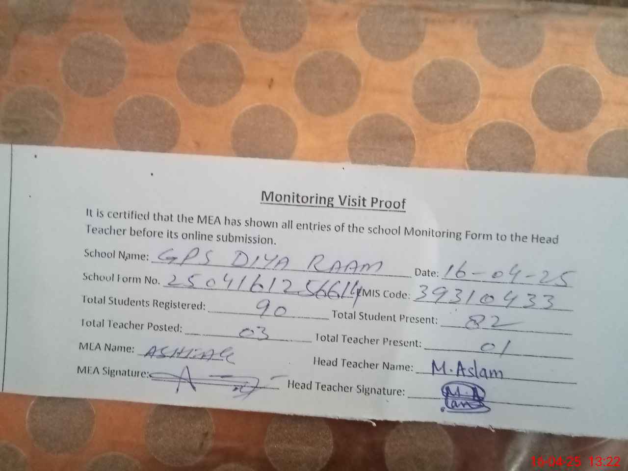| EMIS Code: 39310433 | Name of School: GPS DIYA RAAM | |||