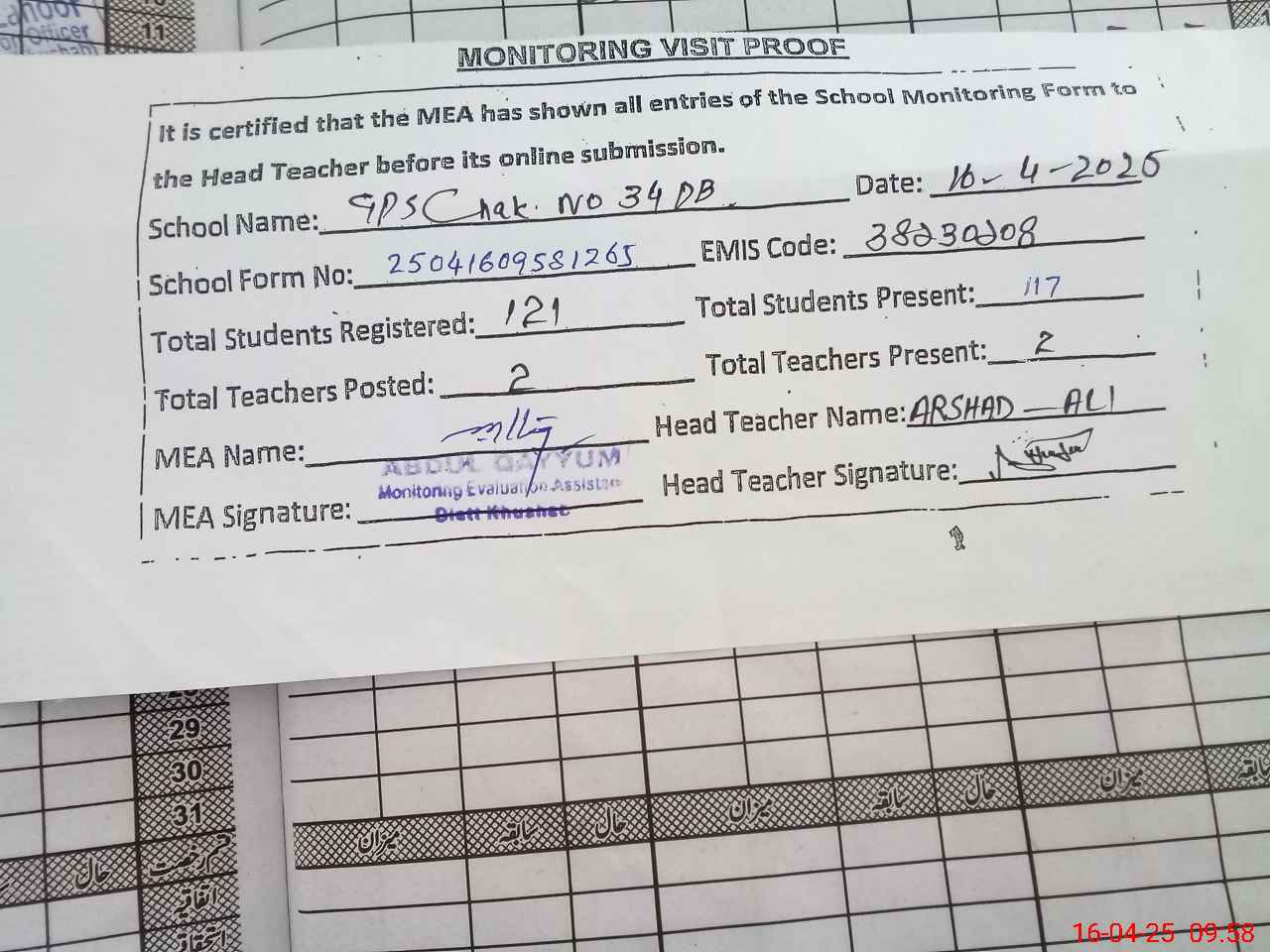 | Attendance Register | Head Teacher | MEA with School | Visit Proof |