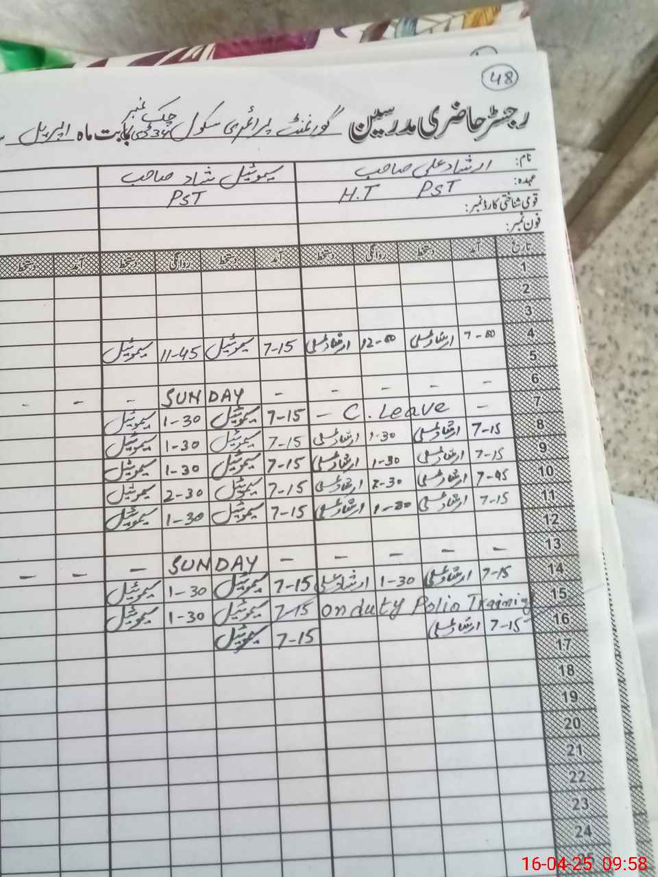 | CNIC | Full Name | Designation | R/C | Absence During Last Calender Month |