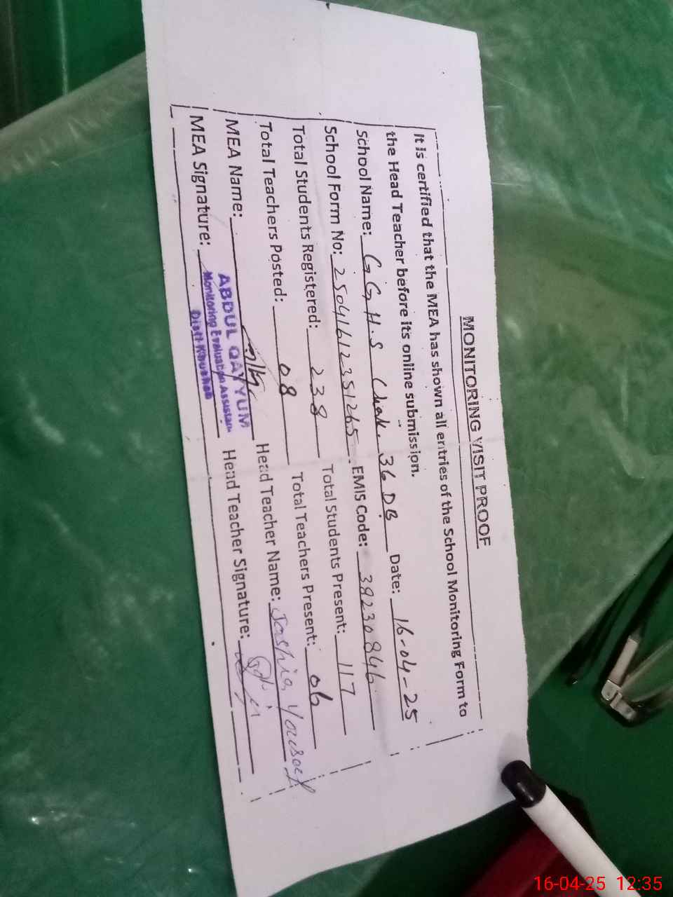 | Attendance Register | Head Teacher | MEA with School | Visit Proof |