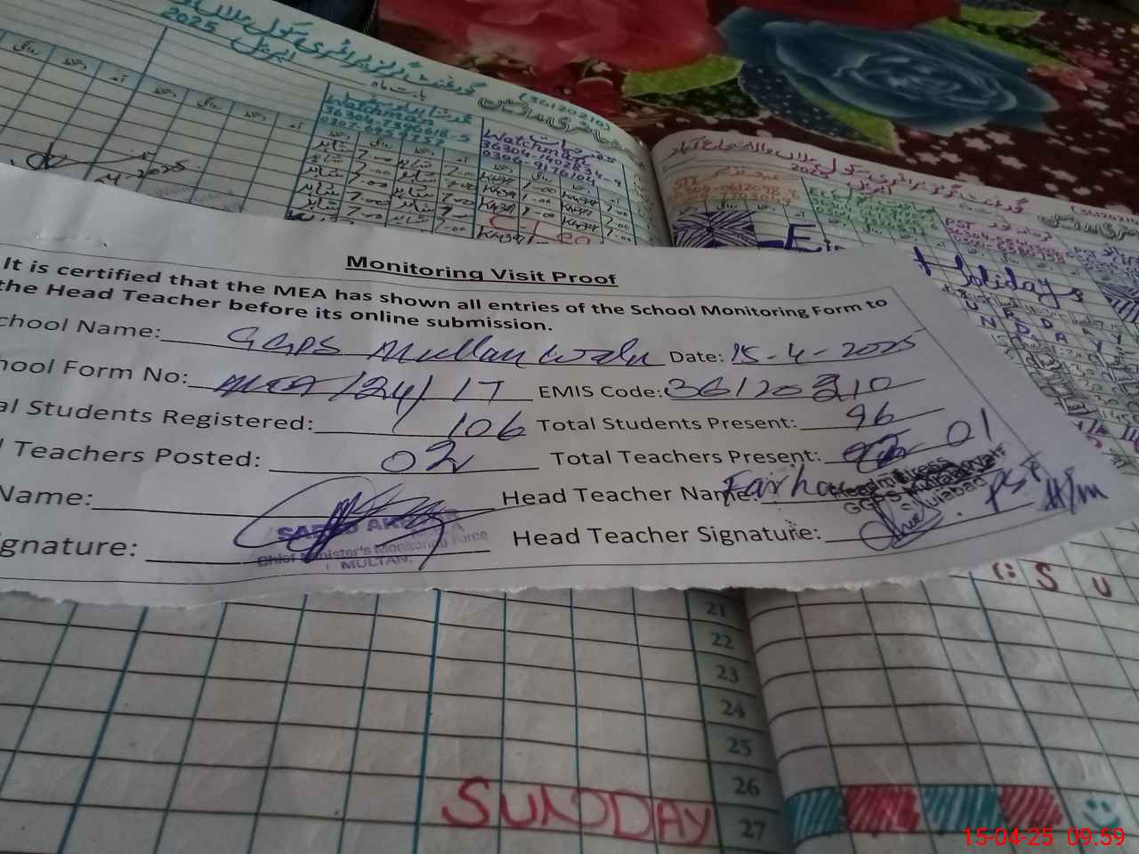 | Attendance Register | Head Teacher | MEA with School | Visit Proof |