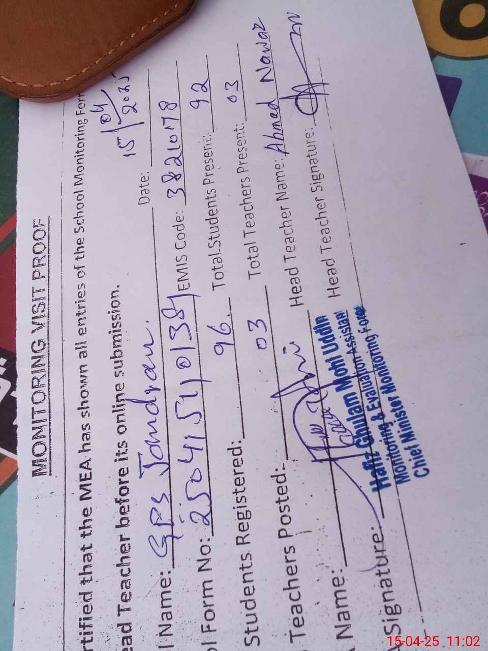 | Attendance Register | Head Teacher | MEA with School | Visit Proof |