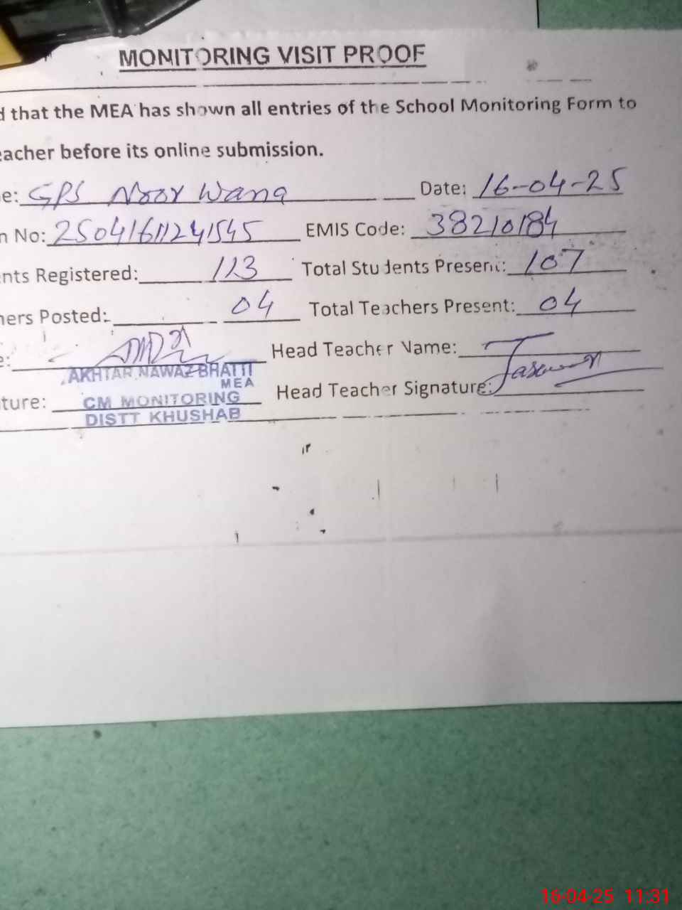 | Attendance Register | Head Teacher | MEA with School | Visit Proof |