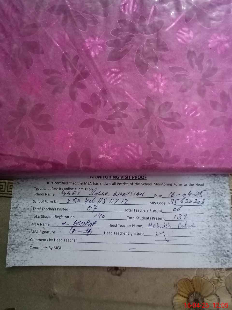 | Attendance Register | Head Teacher | MEA with School | Visit Proof |