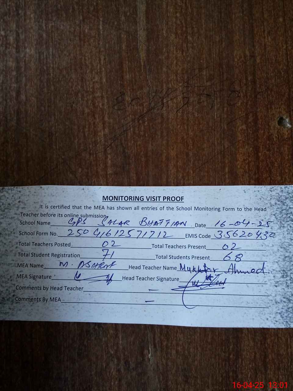 | Attendance Register | Head Teacher | MEA with School | Visit Proof |