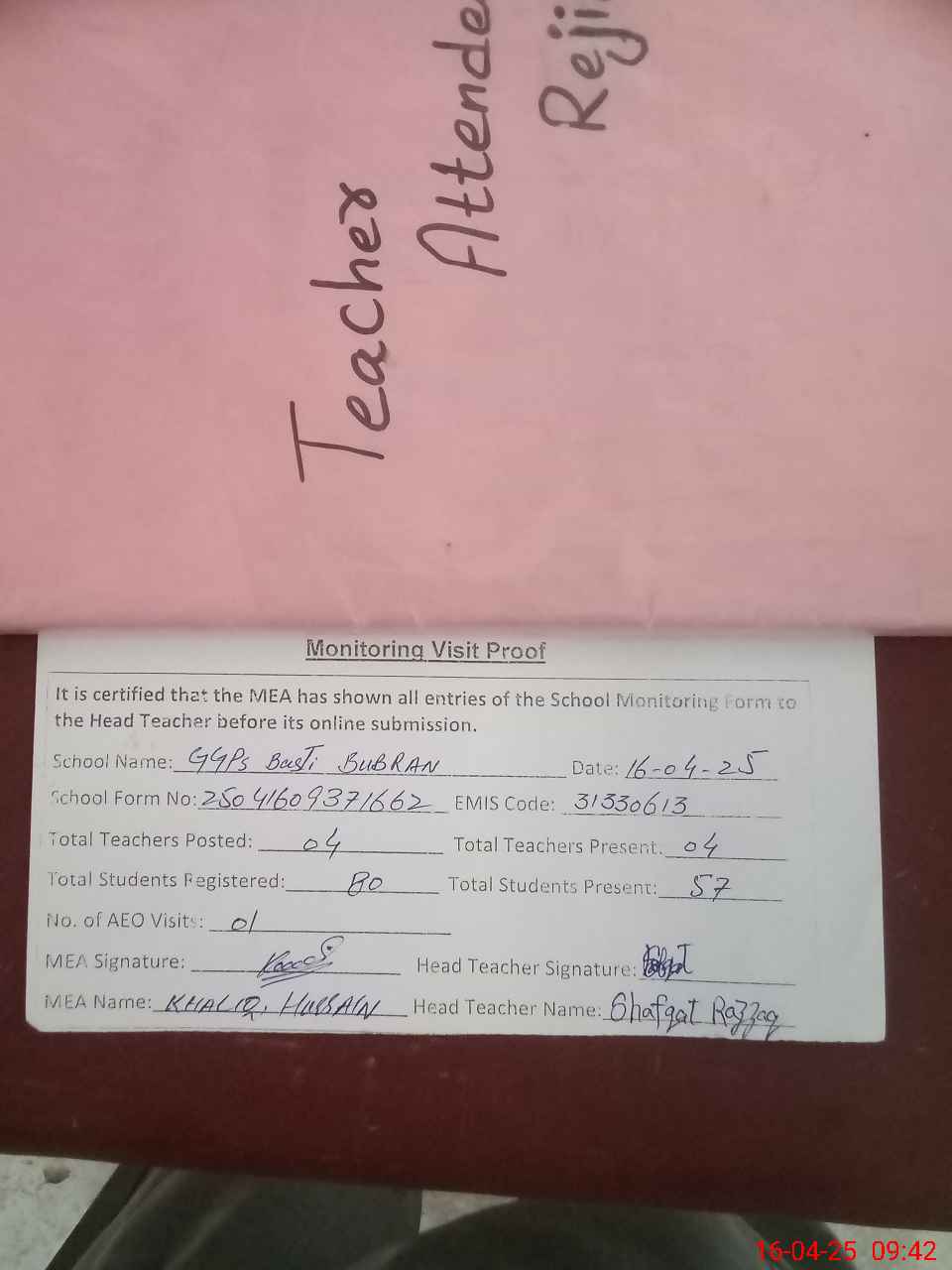 | Attendance Register | Head Teacher | MEA with School | Visit Proof |