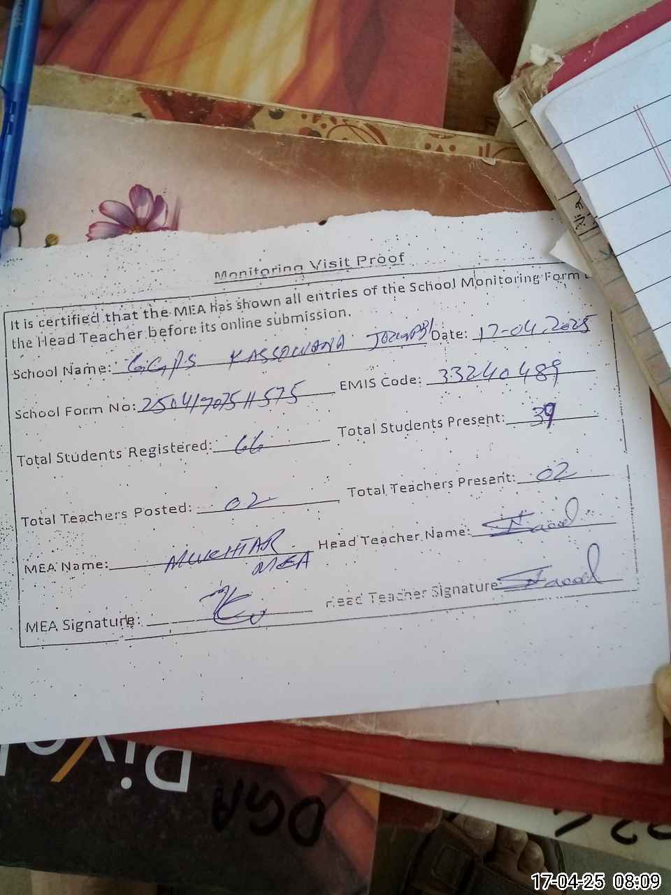 | Attendance Register | Head Teacher | MEA with School | Visit Proof |