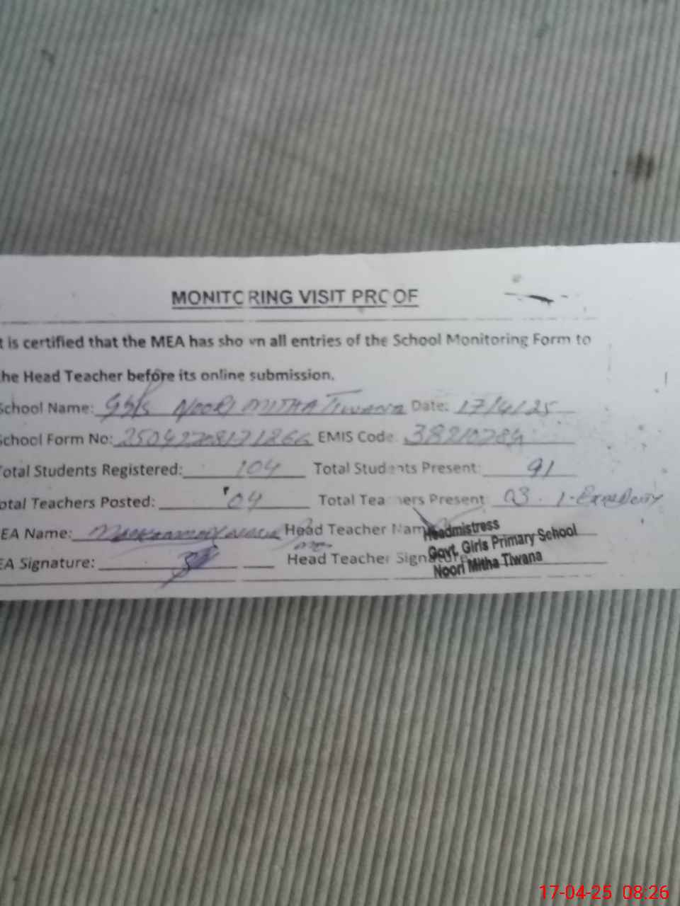 | Attendance Register | Head Teacher | MEA with School | Visit Proof |