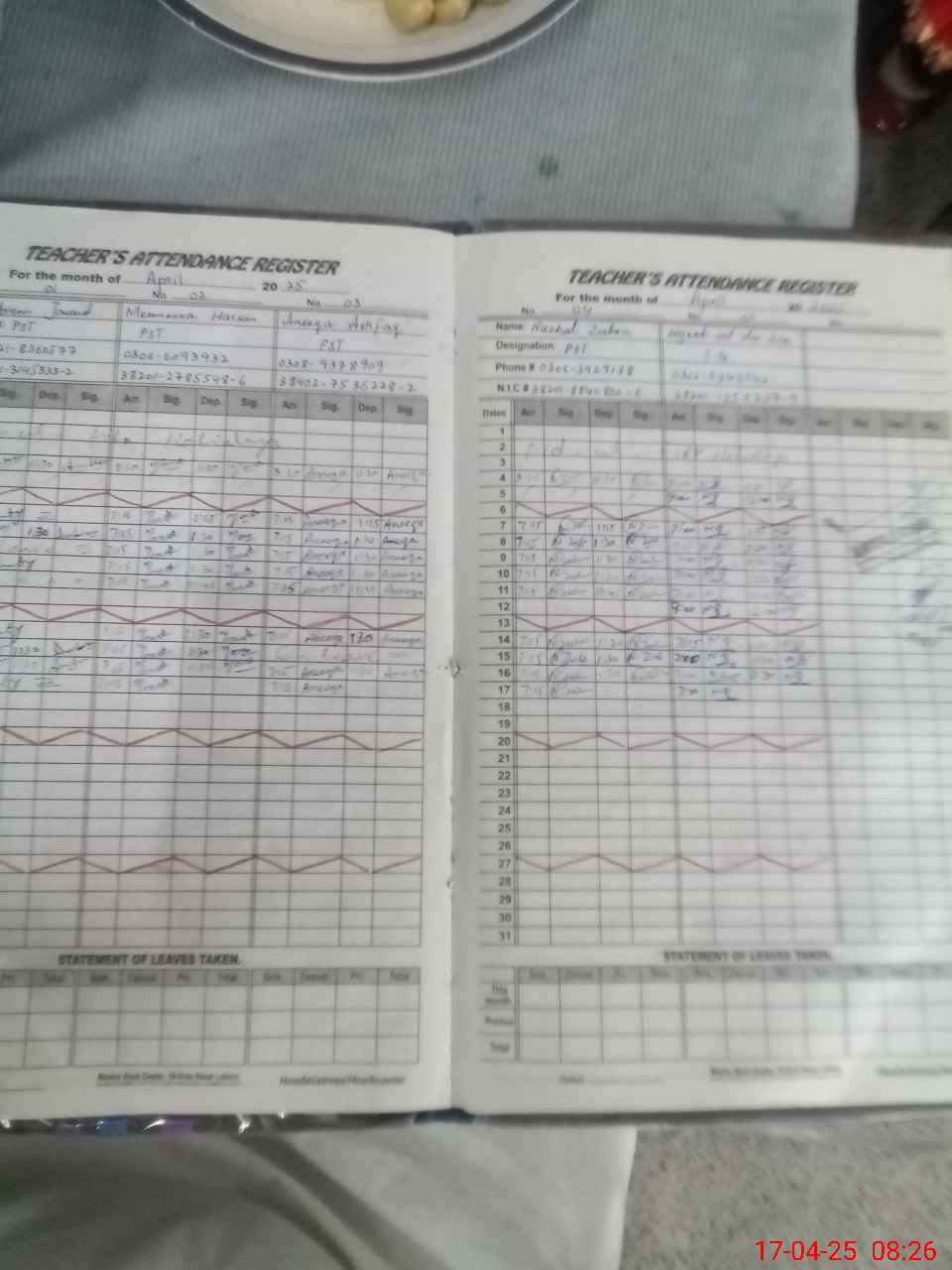 | CNIC | Full Name | Designation | R/C | Absence During Last Calender Month |
