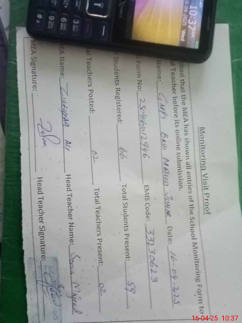 | Attendance Register | Head Teacher | MEA with School | Visit Proof |