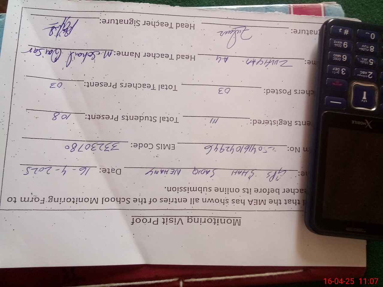 | Attendance Register | Head Teacher | MEA with School | Visit Proof |