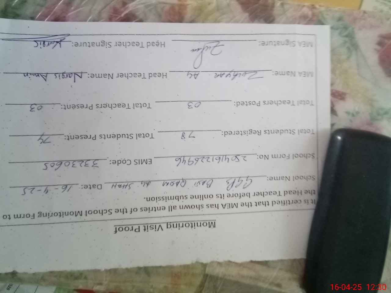| Name: NE**** AM**** Designation: (School Headmaster's/Headmistress's) PST Phone/Cell Number: 03**** |