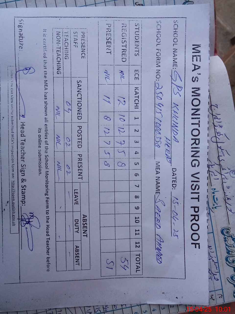 | Attendance Register | Head Teacher | MEA with School | Visit Proof |