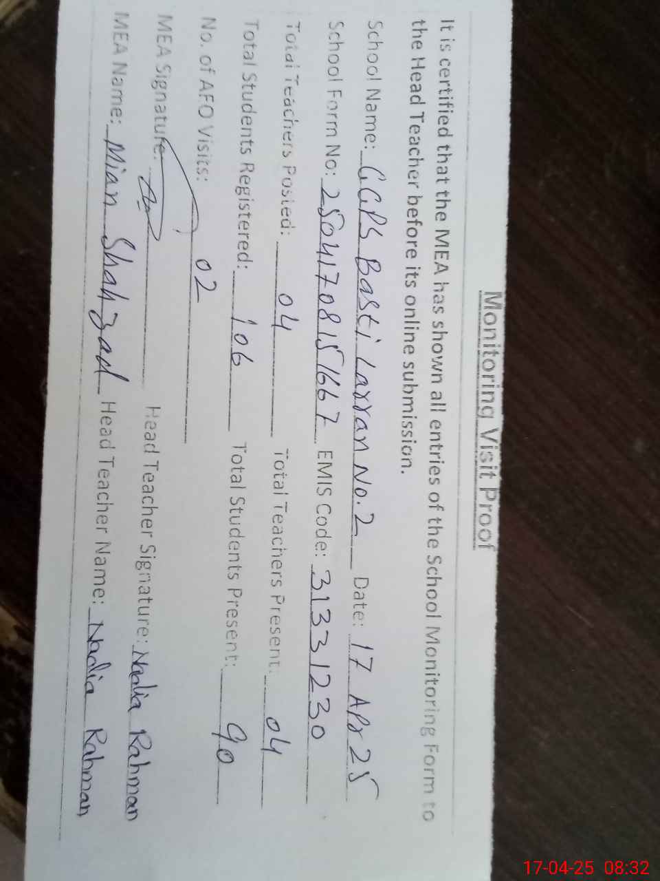 | School Visited by School Health & Nutrition Supervisor (No. of Visits) | 1 | Name1: | Muhammad Zeeshan Aslam | Name2: | Nil |