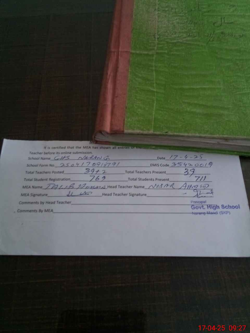 | Attendance Register | Head Teacher | MEA with School | Visit Proof |