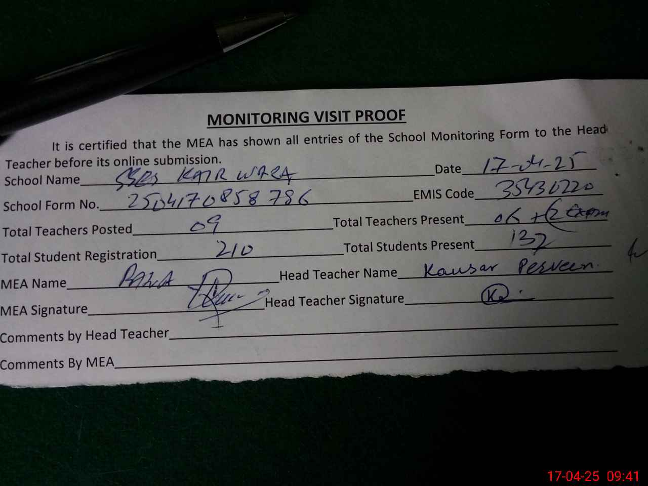 | Attendance Register | Head Teacher | MEA with School | Visit Proof |
