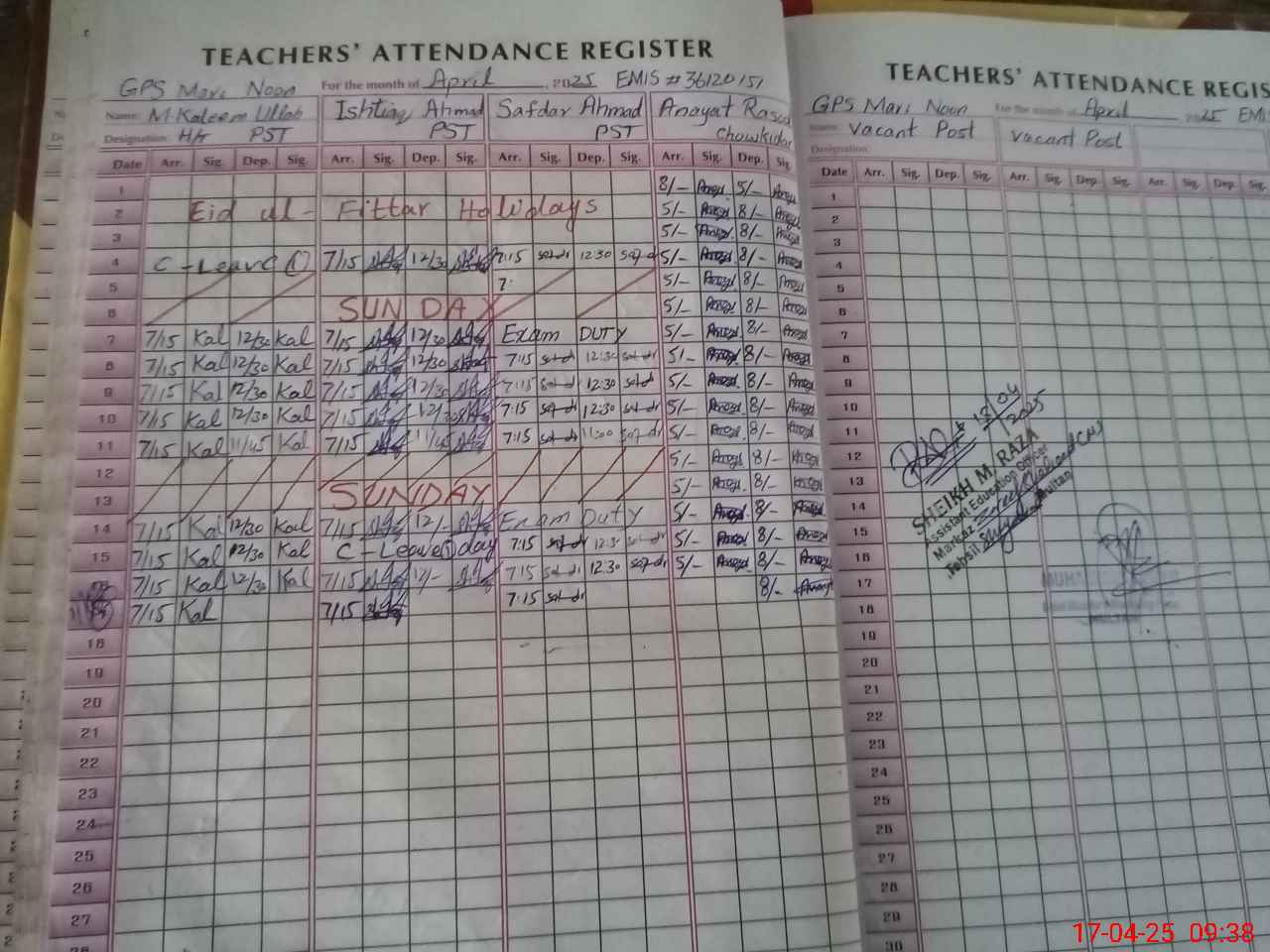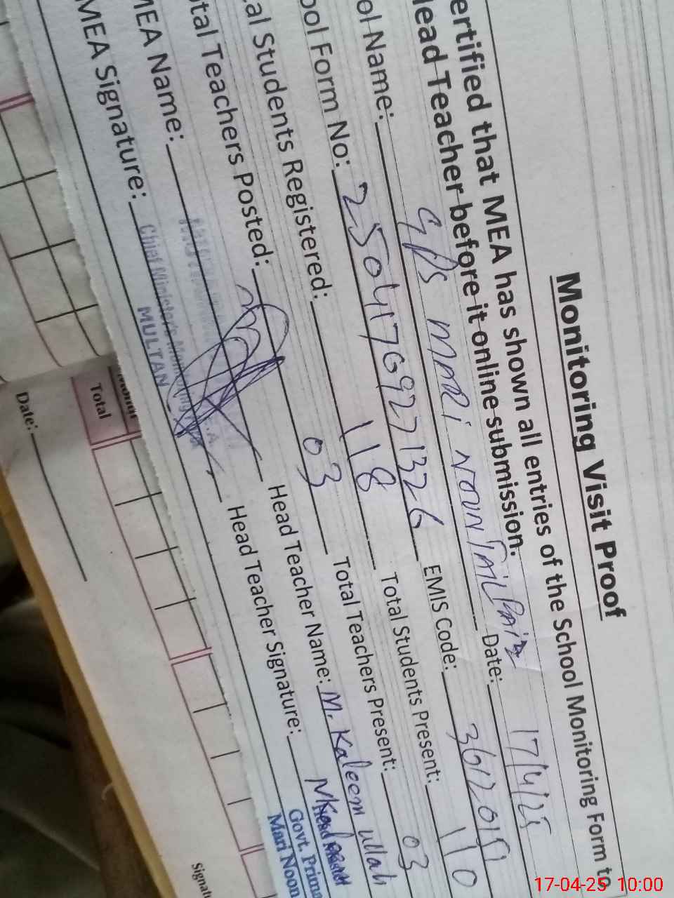 | Attendance Register | Head Teacher | MEA with School | Visit Proof |