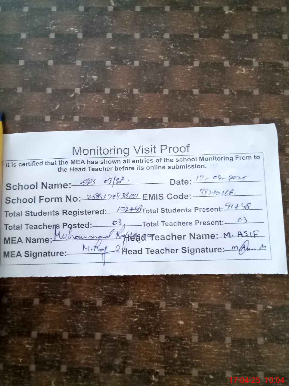 | Attendance Register | Head Teacher | MEA with School | Visit Proof |