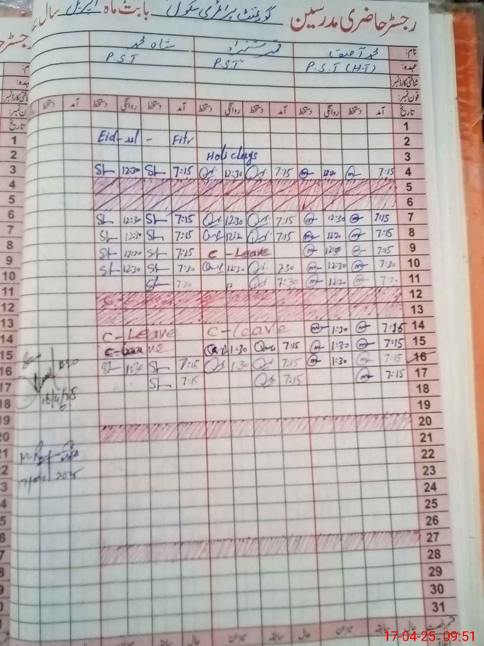 | CNIC | Full Name | Designation | R/C | Absence During Last Calender Month |