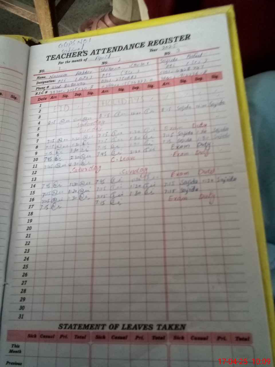 | 38**** | Sa**** Ba**** | PST | Regular | 0 | 0 | 0 | 0 | 0 | 0 | 0 | 0 | 0 | Exam Duty |