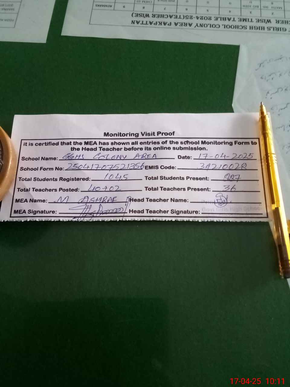 | EMIS Code: 39210028 | Name of School: GGHS COLONY AREA PAKPATTAN | |||