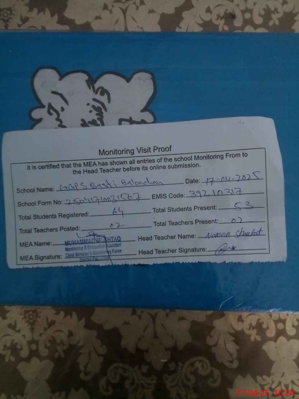 | EMIS Code: 39210317 | Name of School: GGPS BASTI BALOCHAN P/O MALKA HANS | |||