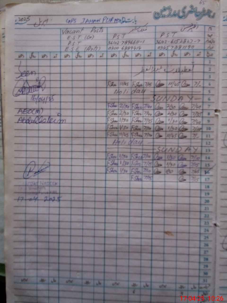| Name: Az**** Hu**** Designation: (School Headmaster's/Headmistress's) PST Phone/Cell Number: 03**** |