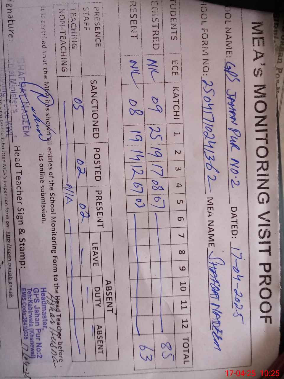 | EMIS Code: 36410535 | Name of School: GPS JAHAN PUR NO.2 P/O NOOR PUR, KABIRWALA | |||