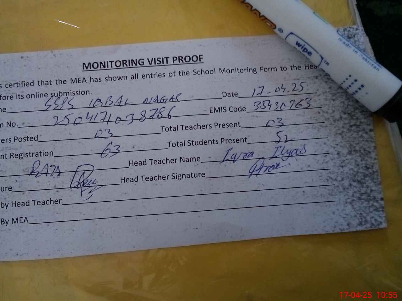 | Attendance Register | Head Teacher | MEA with School | Visit Proof |
