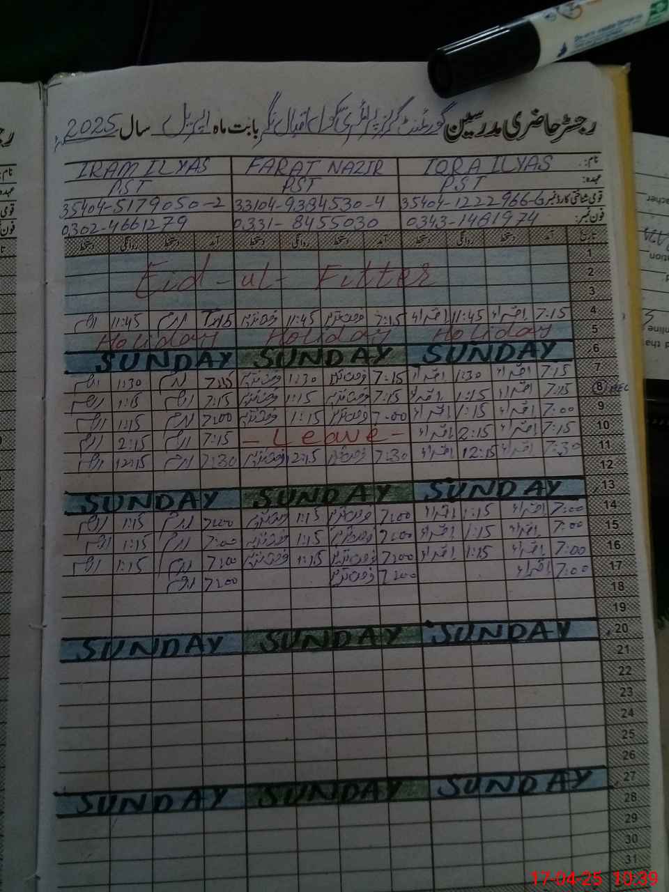 | CNIC | Full Name | Designation | R/C | Absence During Last Calender Month |