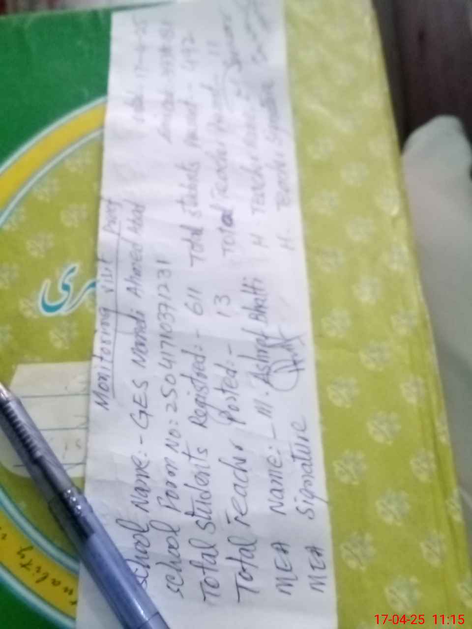 | Attendance Register | Head Teacher | MEA with School | Visit Proof |