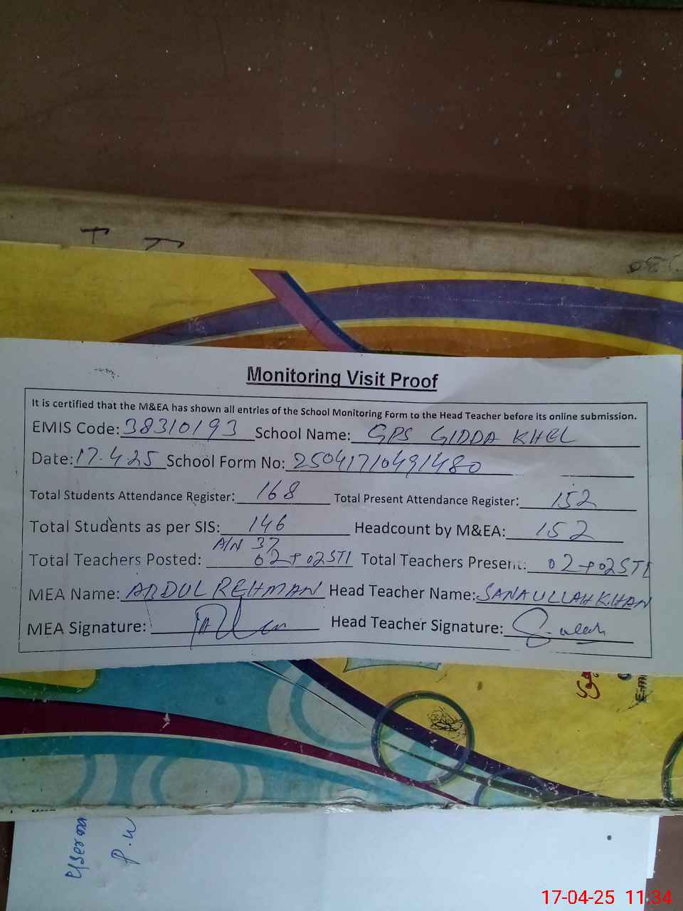 | Attendance Register | Head Teacher | MEA with School | Visit Proof |