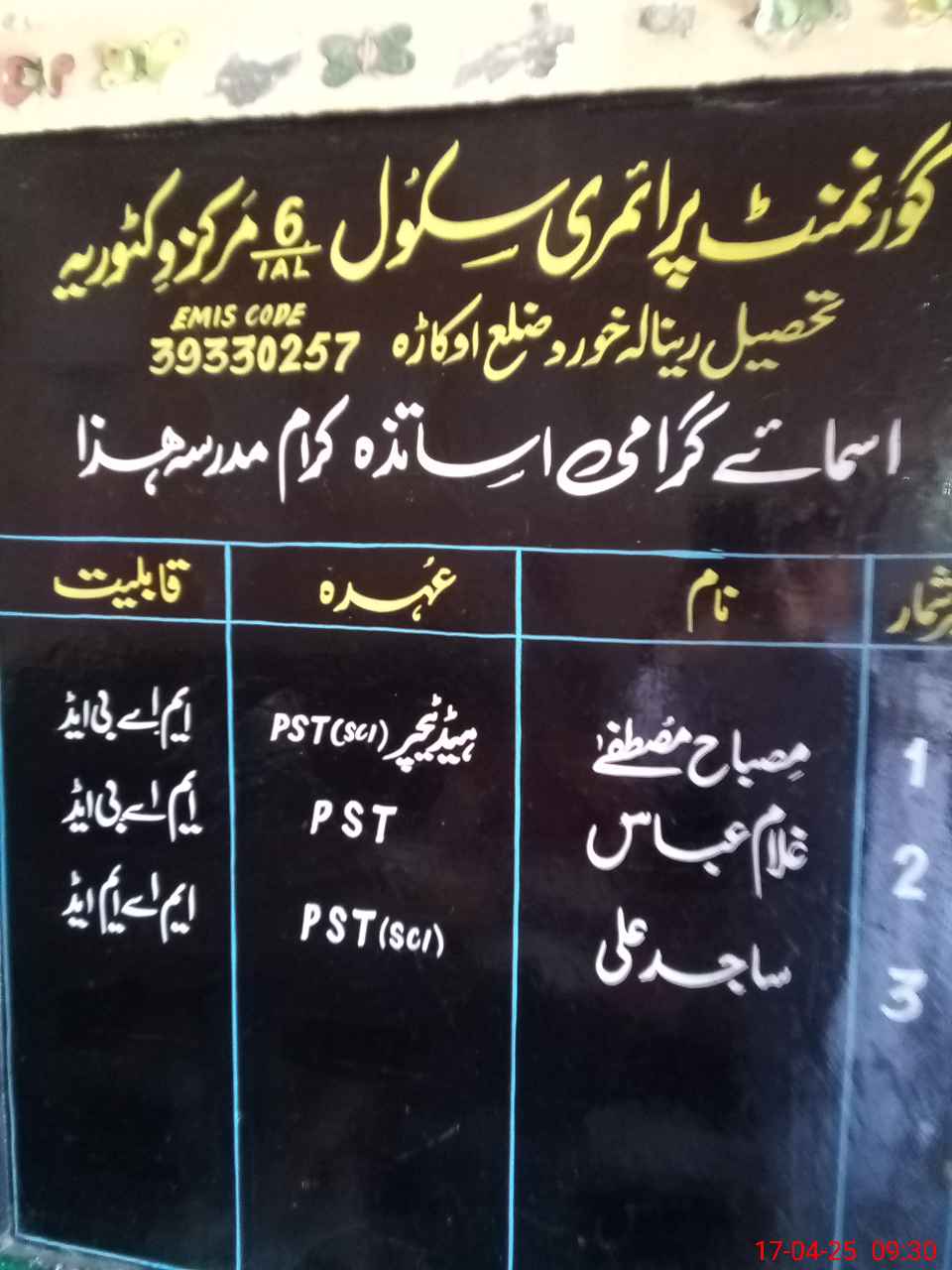 | EMIS Code: 39330257 | Name of School: GPS CHAK 6/1-AL AKHTAR ABAD | |||