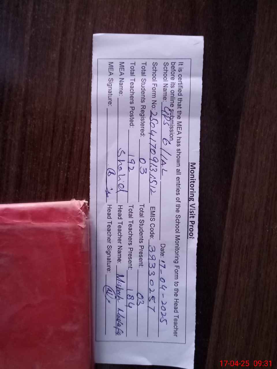 | Attendance Register | Head Teacher | MEA with School | Visit Proof |