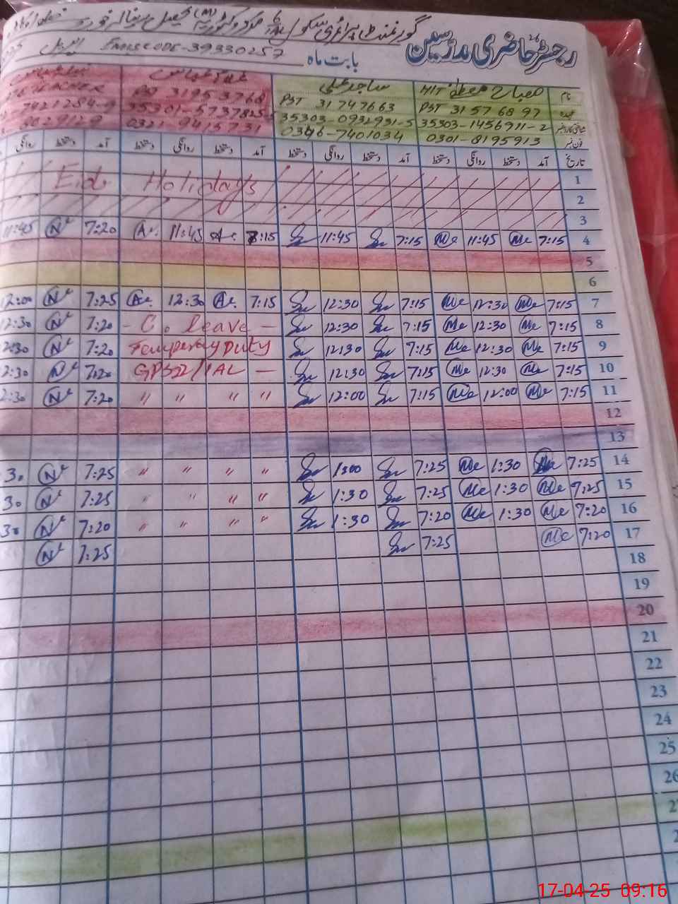 | CNIC | Full Name | Designation | R/C | Absence During Last Calender Month |