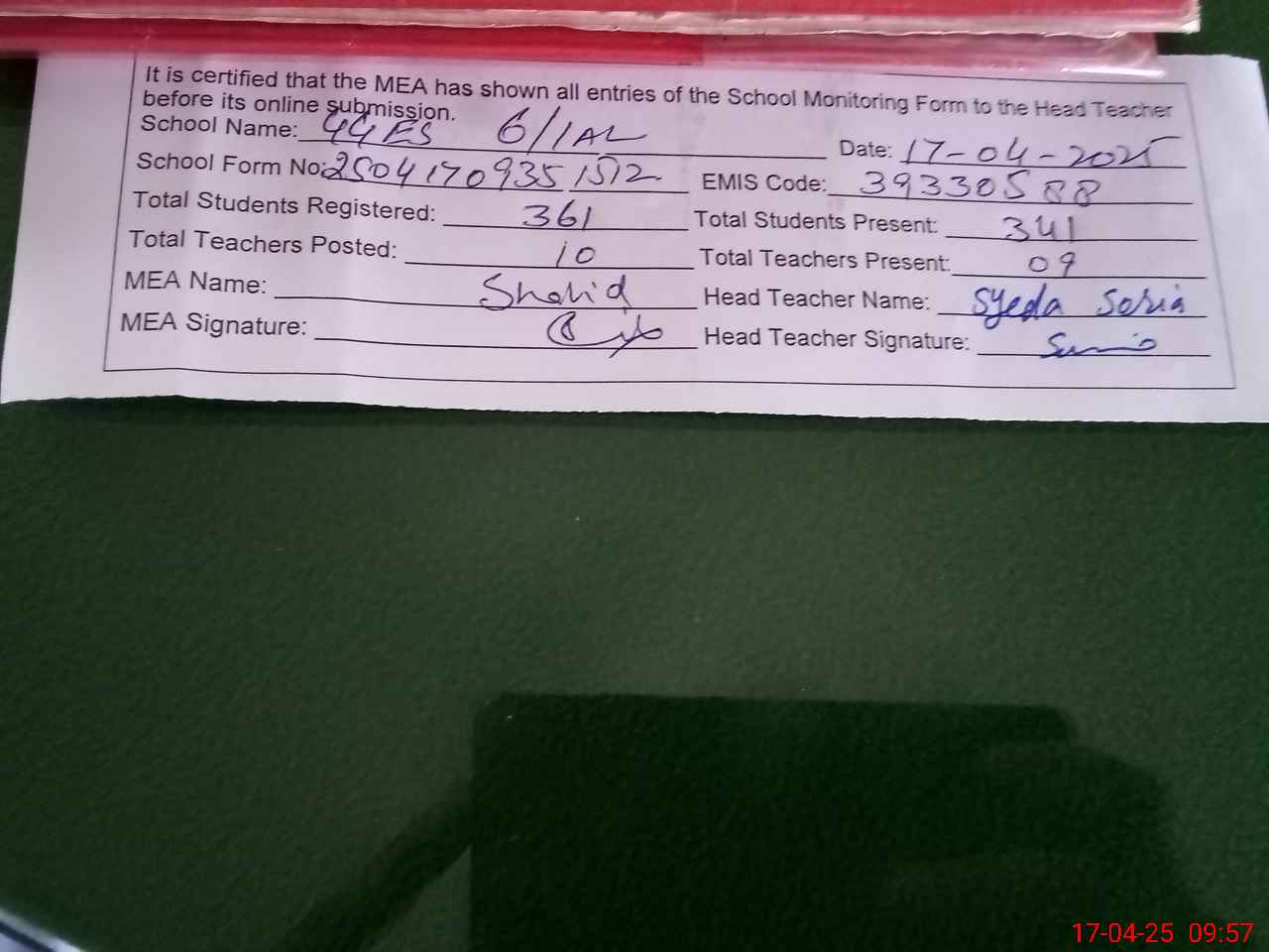 | Attendance Register | Head Teacher | MEA with School | Visit Proof |