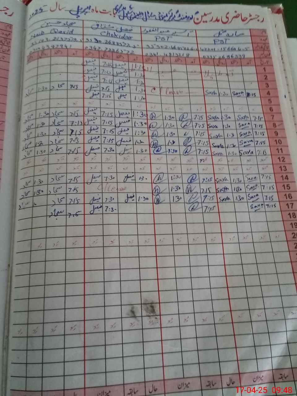 | CNIC | Full Name | Designation | R/C | Absence During Last Calender Month |