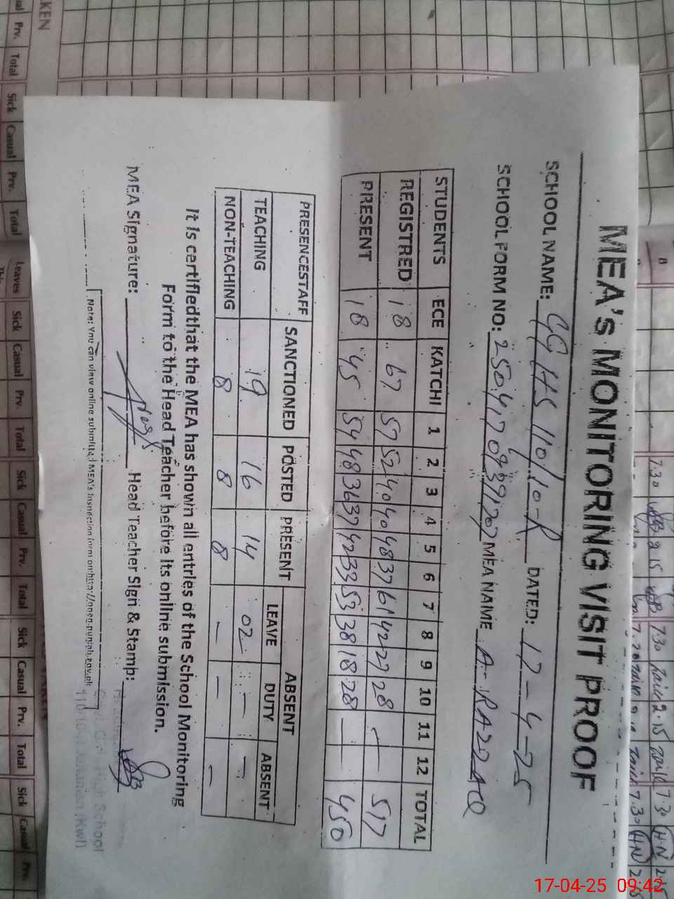 | Attendance Register | Head Teacher | MEA with School | Visit Proof |