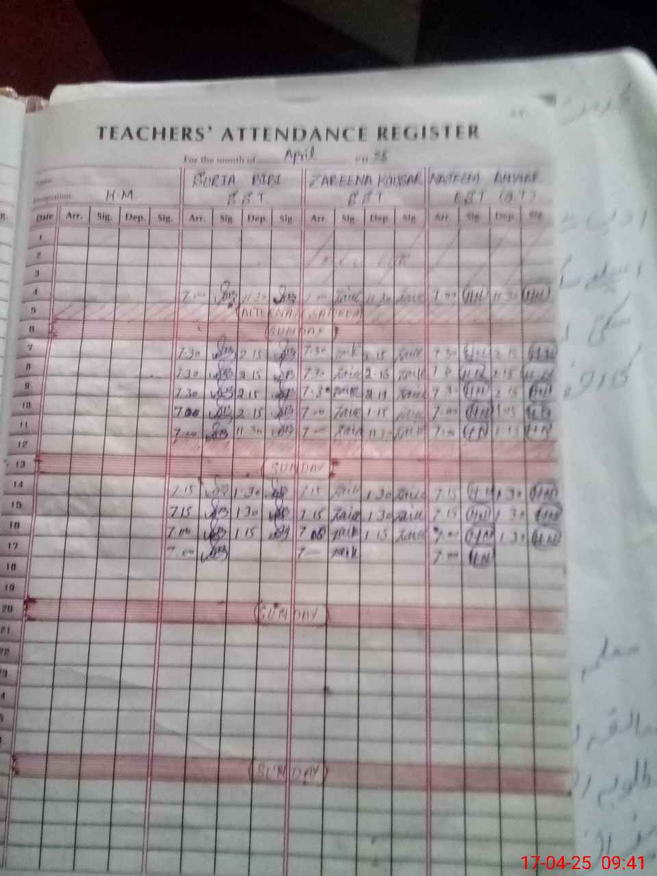 | CNIC | Full Name | Designation | R/C | Absence During Last Calender Month |