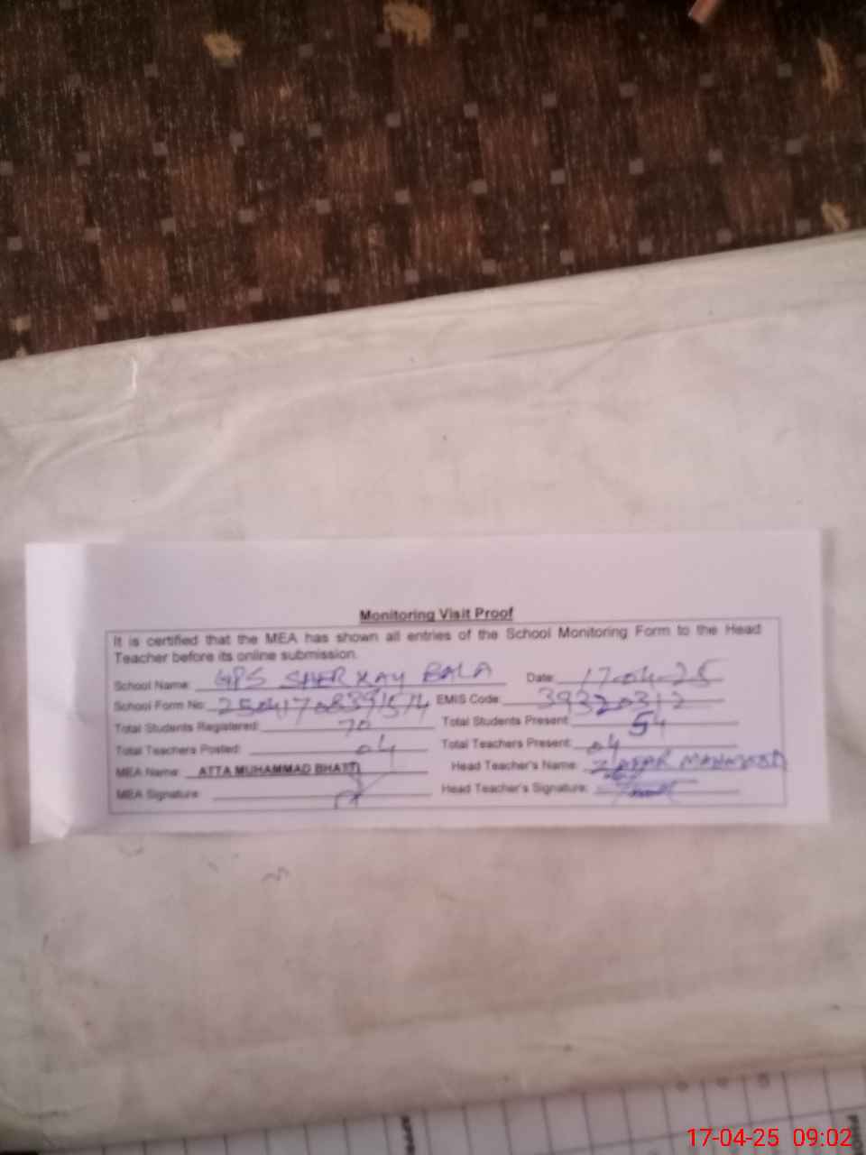 | Attendance Register | Head Teacher | MEA with School | Visit Proof |